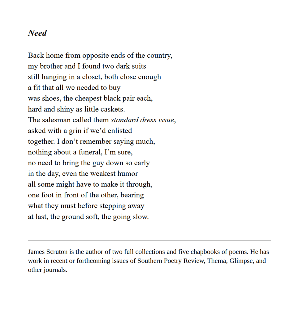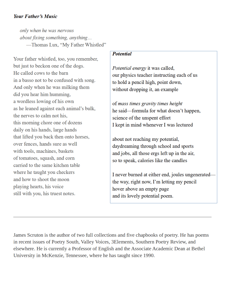 James Scruton is Emeritus Professor of English at Bethel University. He has poems in current or recent issues of Prairie Schooner, I-70 Review, and Comstock Review, and his recent essays have appeared on the website boomspeak.com.