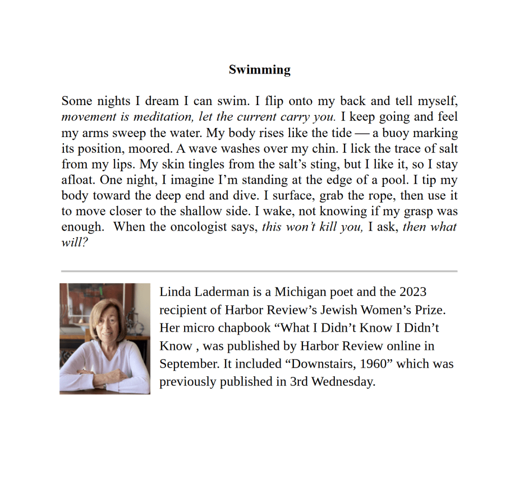 Swimming / Linda Laderman Published on November 11, 2023 by Editorial Staff https://lindaladerman.com/