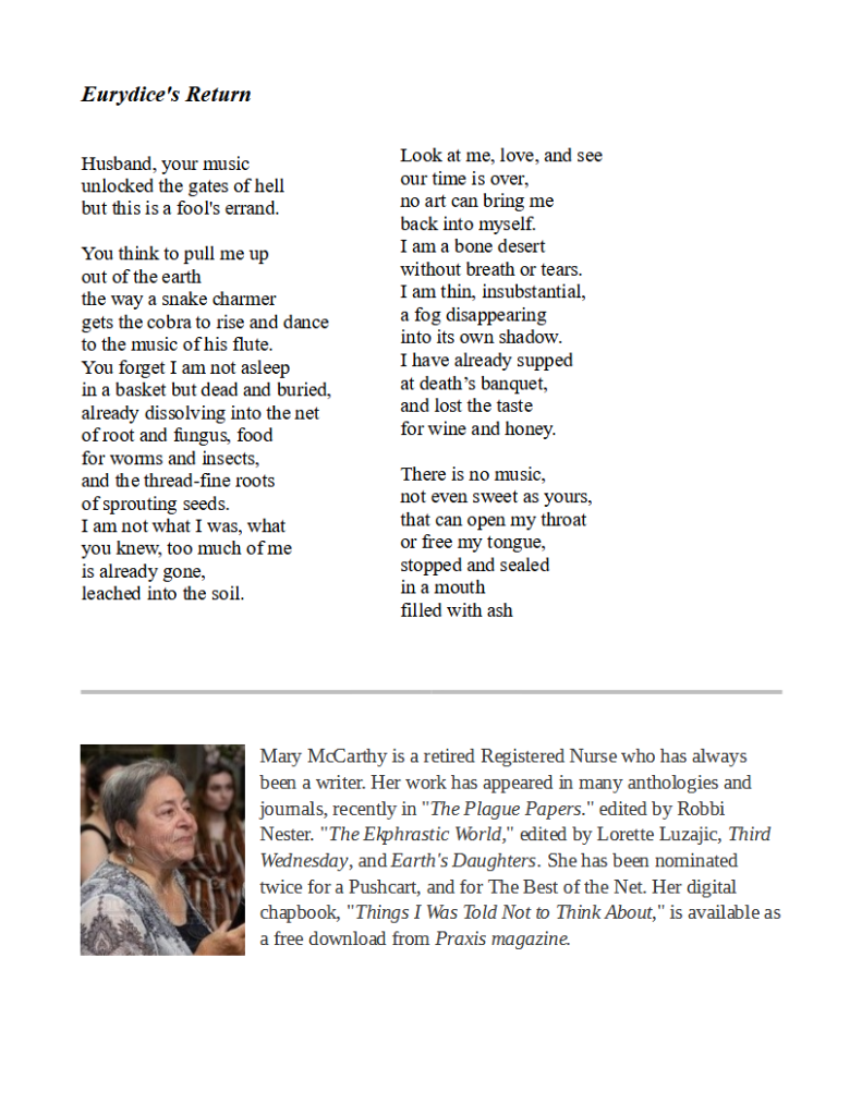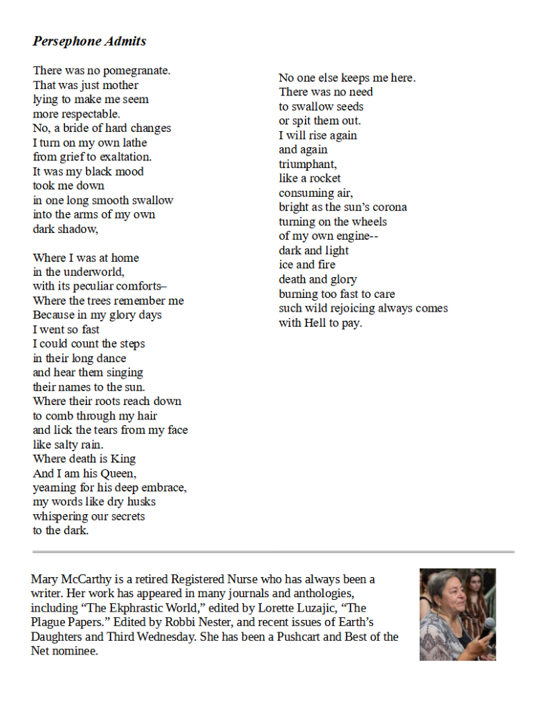Mary McCarthy is a retired Registered Nurse who has always been a writer. Her work has appeared in many anthologies and journals, most lately “The Plague Papers” edited by Robbi Nester, “The Ekphrastic World” edited by Lorette Luzajic, and the latest issue of Earth’s Daughters.