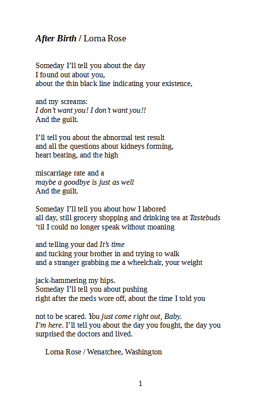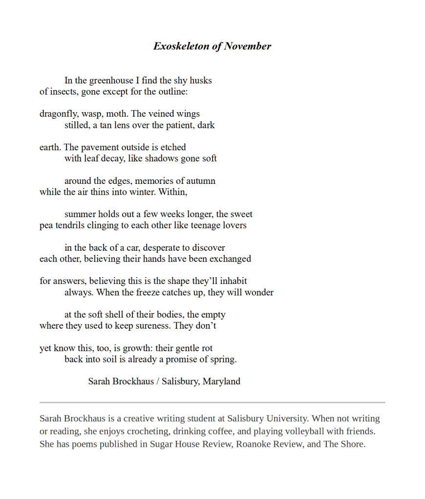 Ordinarily a poet should avoid abstractions but, when handled with great skill, an abstraction can produce something as wonderful as this short poem. Great title, great ending, perfect word choices throughout, Fruition apprears in the summer issue of 3rd Wednesday. Thank you, Carolyn Russell, for showing us how it’s done.