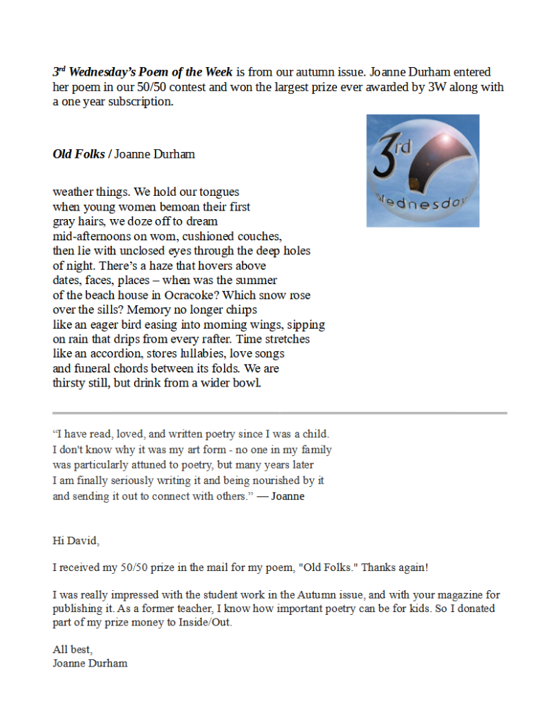 From the fall issue of 3rd Wednesday now avialable free online or in print at Amazon for $8.
