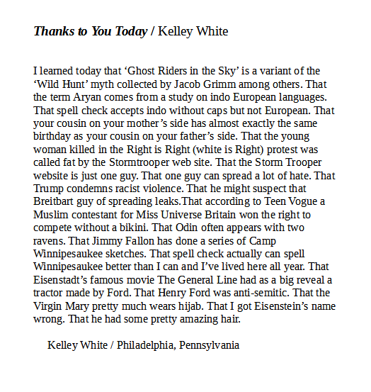 Stream on consciousness can make for interesting (and fun) poetry if it is handled well, as it is in our Poem of the Week by Kelly White. This is from the summer issue of 3rd Wednesday. The free e-edition is up now on our website and print edition is on sale at Amazon – just $8.