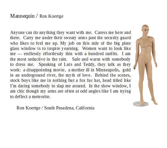 See Ron Koertge’s story, Manaquinn in the fall issue of 3rd Wednesday Magazine: Amazon.