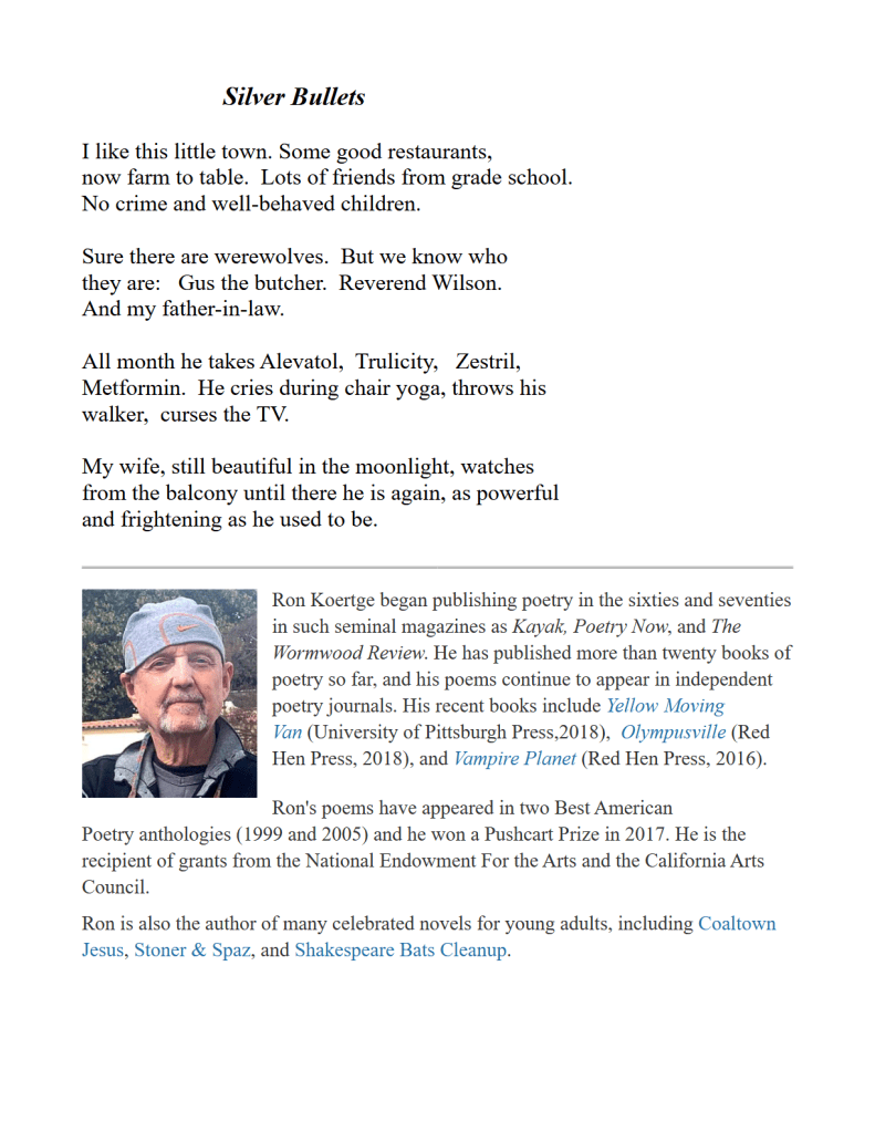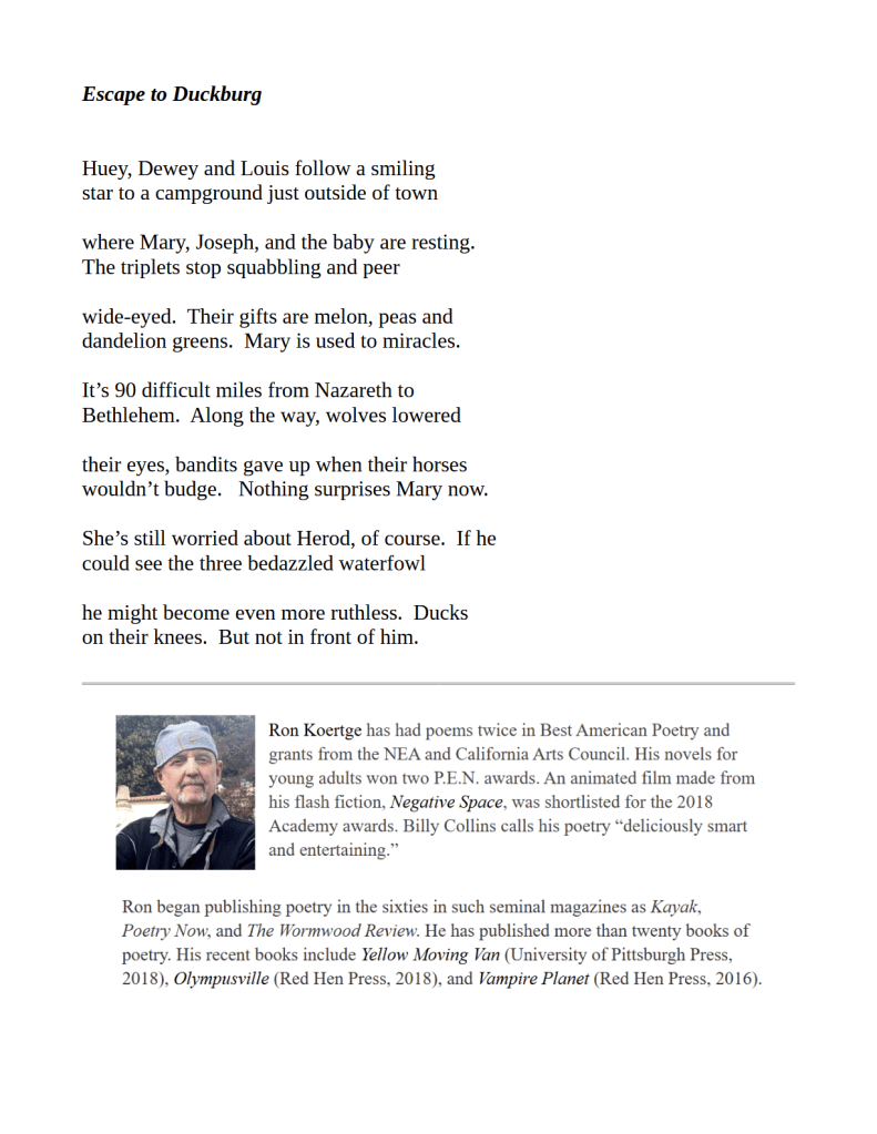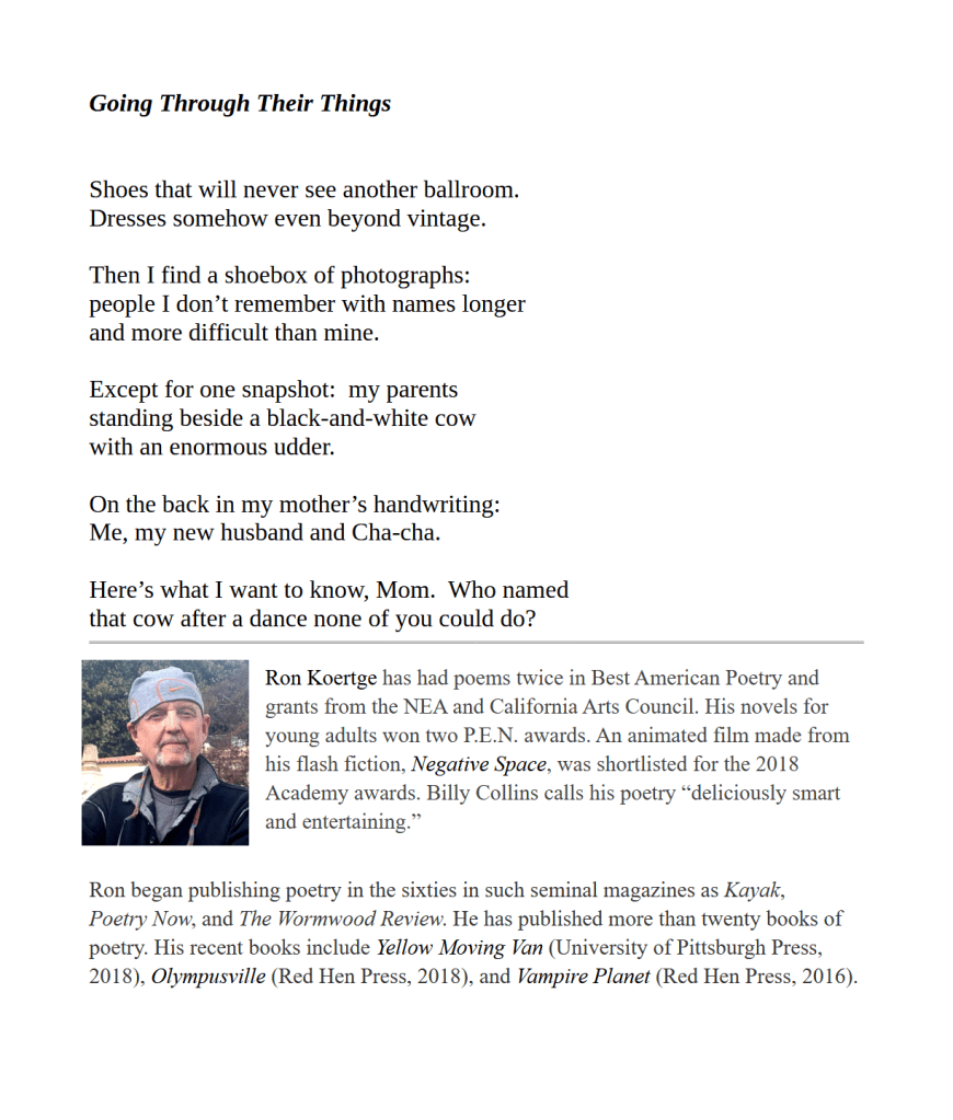 Ron Koertge has had poems twice in Best American Poetry and grants from the NEA and California Arts Council. His novels for young adults won two P.E.N. awards. An animated film made from his flash fiction, Negative Space, was shortlisted for the 2018 Academy awards. Billy Collins calls his presentations “deliciously smart and entertaining.”