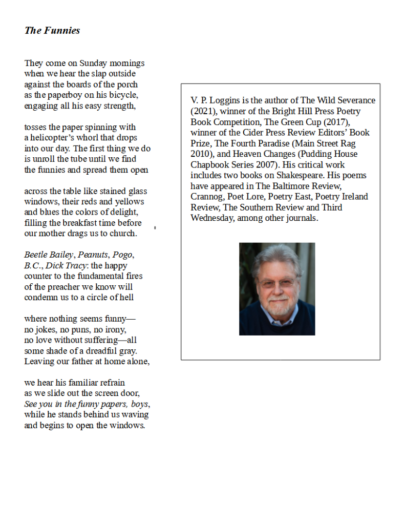 V. P. Loggins is the author of The Green Cup (2017), winner of the Cider Press Review Editors’ Prize, The Fourth Paradise (Main Street Rag, 2010) and Heaven Changes (Pudding House Chapbook Series, 2007). He has published one book of criticism on Shakespeare, The Life of Our Design, and is co-author of another, Shakespeare’s Deliberate Art. His poems and articles have appeared in The Baltimore Review, Crannog (Ireland), The Dalhousie Review, First Things, The Hampden-Sydney Poetry Review, The Healing Muse, Poet Lore, Poetry East, Poetry Ireland Review and The Southern Review, among others. He has been a finalist for the T. S. Eliot Prize, the May Swenson Award, and the Tampa Review Prize. His work has been featured in A Universe of Dreams, poetry and music performed nationally by Neal Conan of National Public Radio and Ensemble Galilei. V. P. Loggins holds a Ph.D. in English Renaissance literature from Purdue University and has taught most recently at the United States Naval Academy.